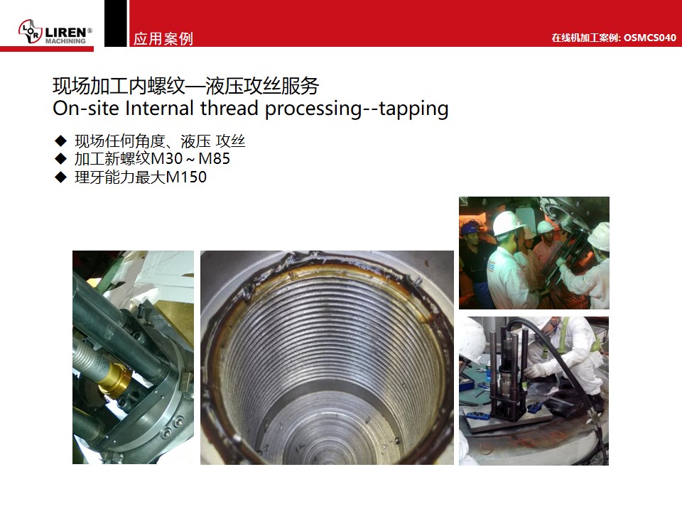 2008年,上海利刃工程技術服務有限公司開拓性地開始了“現場機械加工服務”。現場機械加工,即把專用便攜式機床安裝在需要加工的現場設備上,以實現現場對平面、孔、軸等所需要的車、銑、鉆、鏜、攻絲等各類機械加工。